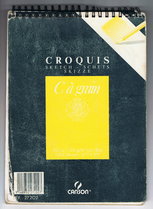 Réaliser des croquis, des dessins d’après nature, est la façon la plus enrichissante, la plus efficace pour parfaire ses connaissances du dessin. Vous emporterez le carnet de croquis avec vous et n'importe où, n'importe quand, tout sera prétexte à être dessiné. Que ce soit pendant un voyage, une promenade ou un simple déplacement. L’aventure peut également commencer chez vous bien au chaud. Il faut tout d'abord bien observer, choisir son sujet, le cadrer (voir la fenêtre en carton), puis croquer sans crainte de recommencer, de consommer le papier et ses outils. Vous serez bien armé si avant de réaliser des croquis, vous maîtrisez les bases théoriques de la perspective, ainsi que les proportions du corps humain. Le carnet de croquis au commencement est un simple outil pour apprendre à construire, puis à suggérer, à observer un objet, une scène ... Prendre le temps de poser un regard attentif sur une (les) chose(s), toujours du plus simple vers l’un peu plus complexe. Comme si vous découvriez pour la première fois la chose, qui pourtant est quotidienne. Souvent vous observerez en fermant un œil pour effectuer vos observations avec la précision nécessaire. Pour commencer, vous ne devez attendre aucun résultat esthétique (c’est peut-être cela véritablement le plus difficile) car sinon, cela vous écartera du bon cheminement de l’apprentissage. Cela veut dire que vos dessins croqués en quelques minutes, n’auront comme premier objectif : d’apprendre à capturer l’essentiel de la chose vue (ses proportions, sa perspective …). Aucun détail ne devra être noté, uniquement l’essentiel ! Pour détailler la logique : les détails certes apportent l’esthétique, le pittoresque, ils sont plutôt faciles à réaliser, mais ils vont demander du temps ! Du temps avec lequel le néophyte pourrait travailler ce qui lui manque le plus, c’est-à-dire saisir l’essentiel : poser l’armature du dessin sans mauvaises perspectives ou proportions. Peu importe que la fenêtre n’ai pas de jardinière ou de rideau, que le randonneur n’ait pas son sac à dos, que la maison n’ait pas toutes ses tuiles et briques. Après ce stade épuré, vous gagnerez rapidement en assurance. Vous savez saisir l’essentiel. Vous pourrez doucement agrémenter vos croquis, mais toujours en préférant la suggestion à l’abondance de détails.