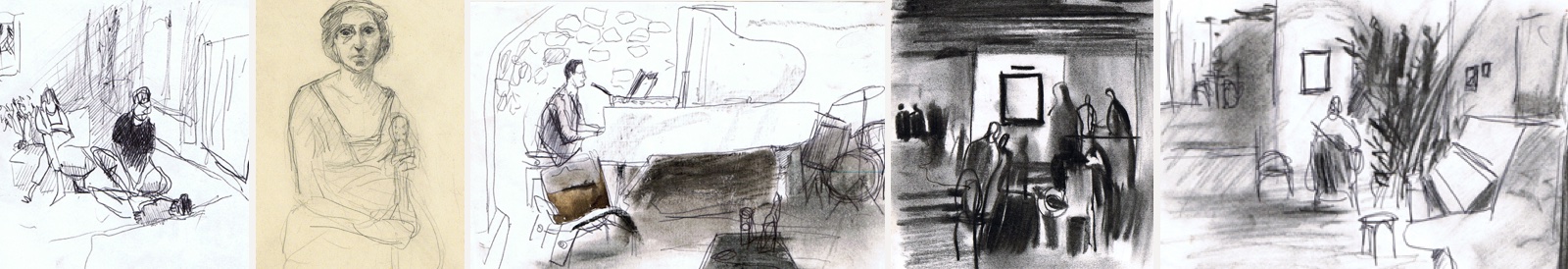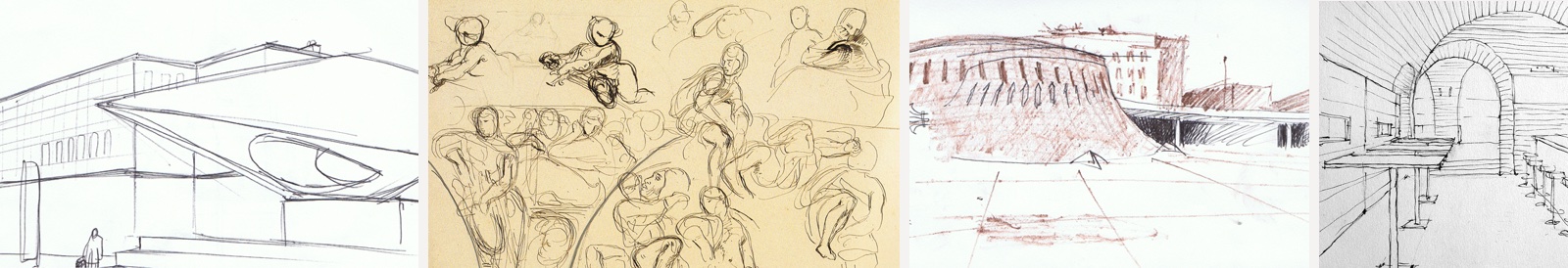 Le but est de se rapprocher de ce que l’œil voit, sans pour autant vouloir faire de la photo avec du dessin. Le trait du croquis d’observation est à la fois précis et rapide. L’expérience des étapes précédentes est importante pour que le dessinateur maîtrise à la fois dans la suggestion et la précision. Vous ébaucherez le dessin d’un trait extrêmement léger par une phase « croquis de construction » puis vous poursuivrez. Commencez avec un objet, une personne seule, puis … Notez : le croquis d’observation est un croquis de trait, de matière, avec les principales valeurs des ombres et des lumières. Il doit garder sa qualité de croquis. Il ne doit pas être confondu avec le dessin d’observation, beaucoup plus posé, à l’observation presque clinique, très précise, au caractère plus figé … Pour une scène plus complexe, l’on traitera les lointains en croquis de suggestion.