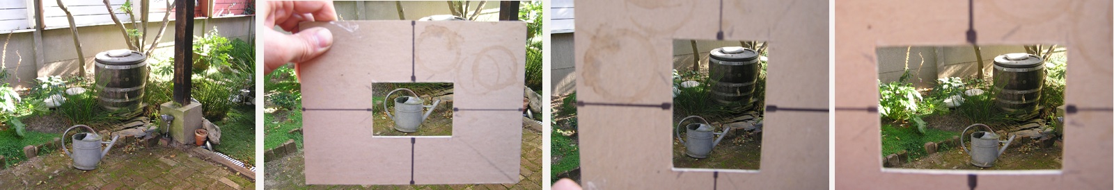 FABRICATION : au centre d’un carton gris épais d’environ 16/20 cm, découpez un rectangle proportionnel aux feuilles de votre carnet de croquis, tout en préservant un cadre assez large (3 à 4 cm). Au feutre sur les rebords du cadre découpé au centre du carton, marquez d’un repère les médianes du rectangle. UTILISATION : cette fenêtre en carton est « un écran plat », plat comme votre feuille de croquis aux mêmes proportions. Tendez le bras muni de votre fenêtre en carton, fermez un œil, puis visez en scène comme le ferait un photographe. Vous explorerez la subtilité de votre cadrage, en déplaçant doucement le cadre de carton, en rapprochant doucement de votre vue le cadre (vous réalisez un « zoom ») … Grâce aux repères des médianes, vous êtes capable de voir si un élément de votre composition est au centre, ou légèrement décentré vers le quart gauche du bas ou droit du haut … Multipliez les observations … Grâce aux bords horizontaux, vous définirez plus facilement les angles de certaines lignes de fuite (les subtiles que l’on exagère – les franches que l’on atténue). La fenêtre doit vous aider au début de votre croquis, (puis s’en affranchir doucement). Rappel important : OBSERVATION AVEC UN SEUL OEIL OUVERT.