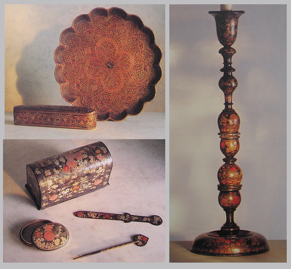 CI CONTRE : --- Plateau et plumier Indiens, fabriqués au Cachemire au 19e siècle. Décor peint avec incrustation de feuilles d'or (nom de la technique datant du 15e : Kari-qalam). --- Nécessaire à écrire au Cachemire (19eS.) comprenant un coffret pour le papier, un porte plume, un boite ronde pour les plumes de rechange et un coupe papier. Décor de fleurs et d'oiseaux peints sur fond laqué, selon un style italien très vif. --- Bras de lumière (porte chandelle) en pâte à papier moulée à l'aide d'une presse et recouverte d'un vernis très brillant. Importation au 19e siècle du Cachemire. À l'époque parmi les objets les plus demandés en Occident.