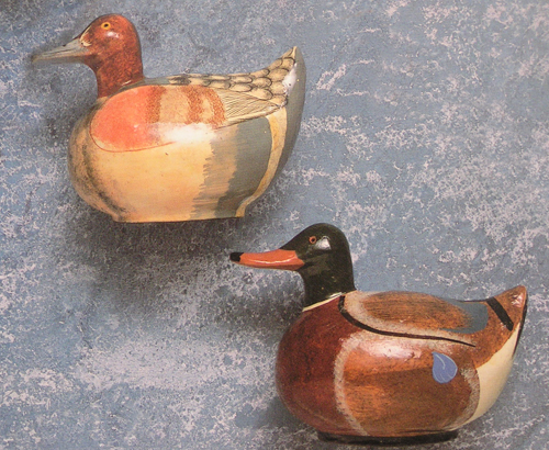 Emblème de fidélité en Chine, ces canards sont fabriqués en Inde, polis, vernis, ils recréent le travail du bois sculpté. Le dessin ajoute à l'illusion